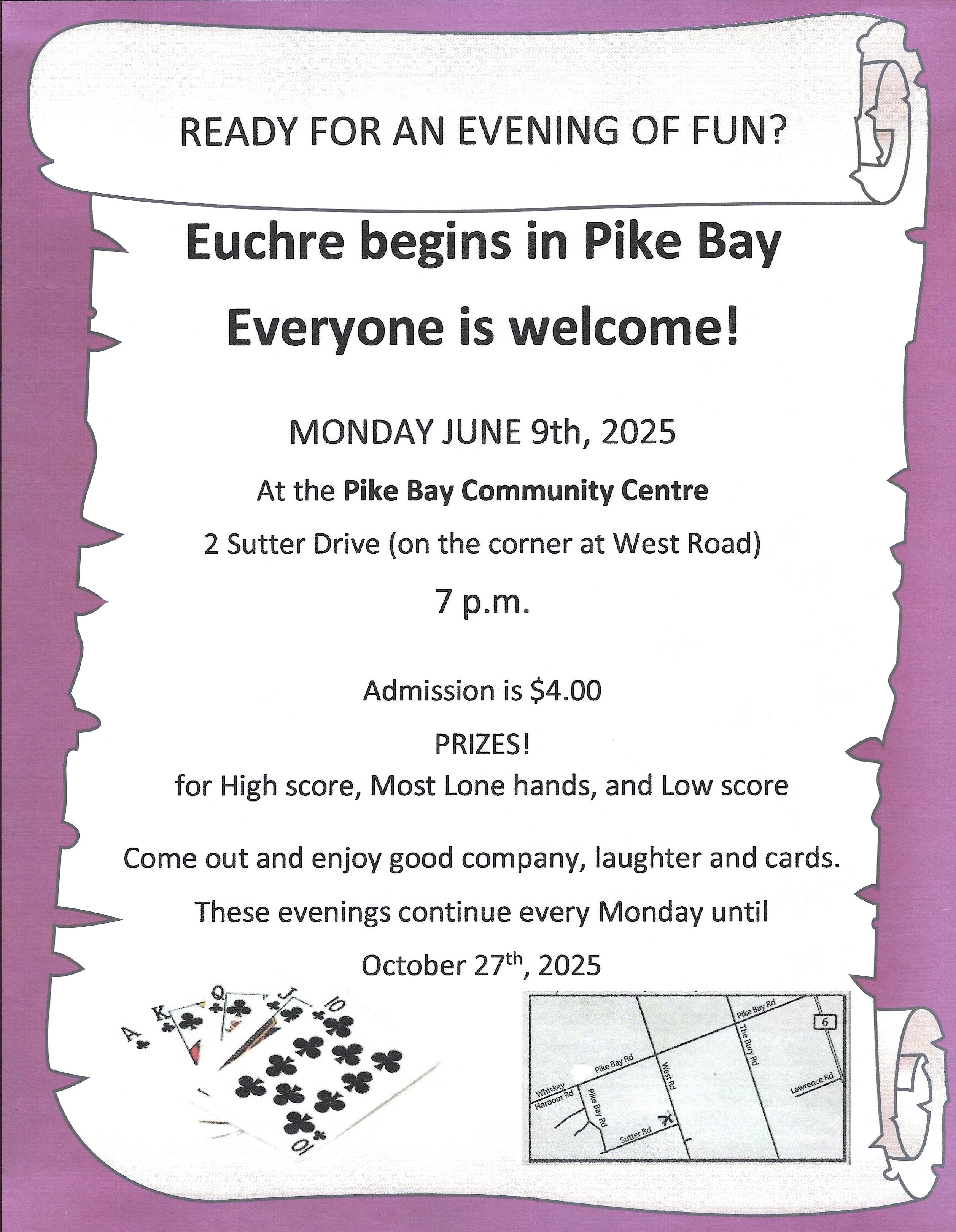 Euchre starts Monday evenings, 7 pm, at the Pike Bay Community Centre. It will running from June 9 2025 until October 27 2025. Admission is $4.