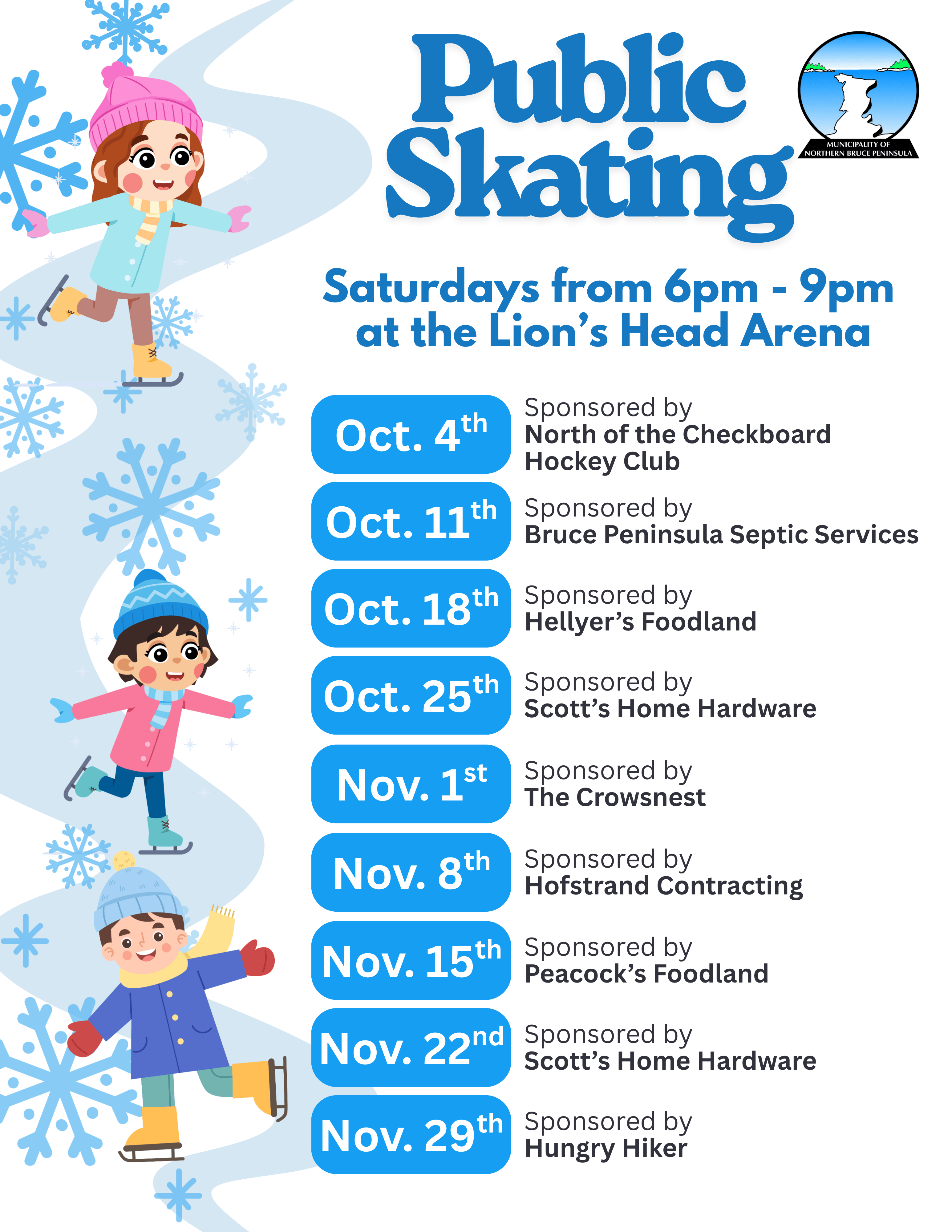 Free Public Skating every Saturday in October and November from 6pm to 9pm, generously sponsored by local businesses!