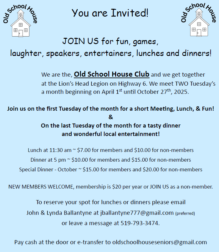 Old School House Club gets together at Lion's Head Legion twice a month from April to October. The first tuesday of the month for a lunch (11:30 am), meeting and fun! And of the last Tuesday of the month for dinner (5pm) and entertainment!