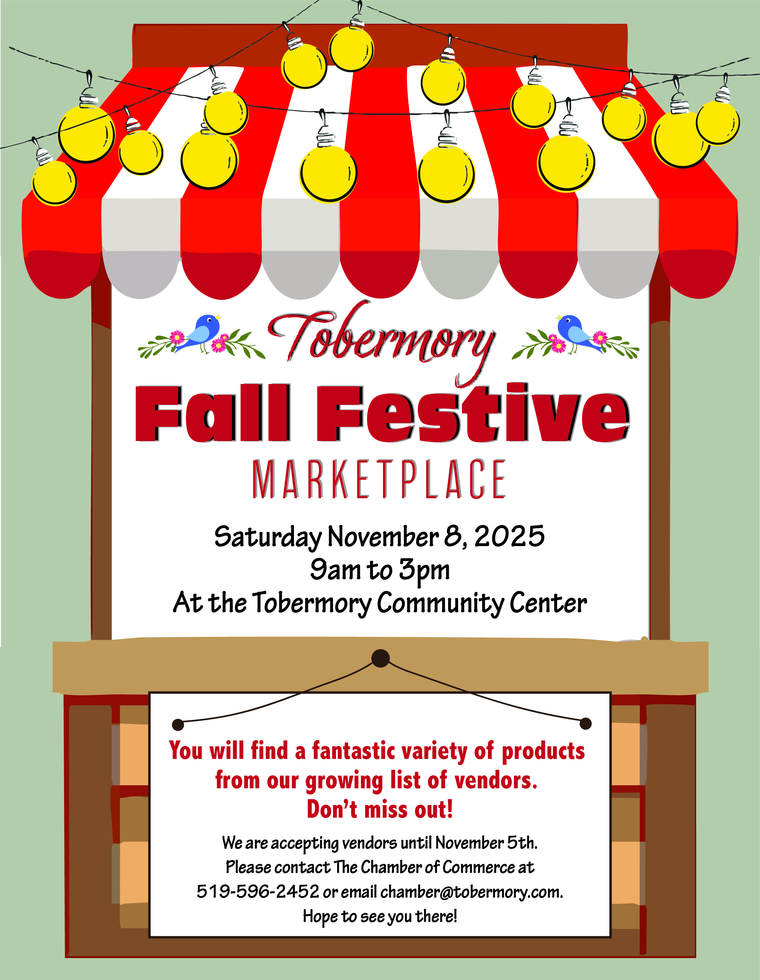 We are accepting vendors until November 5th. Please contact the Chamber of Commerce at 519-596-2452 or email chamber@tobermory.com